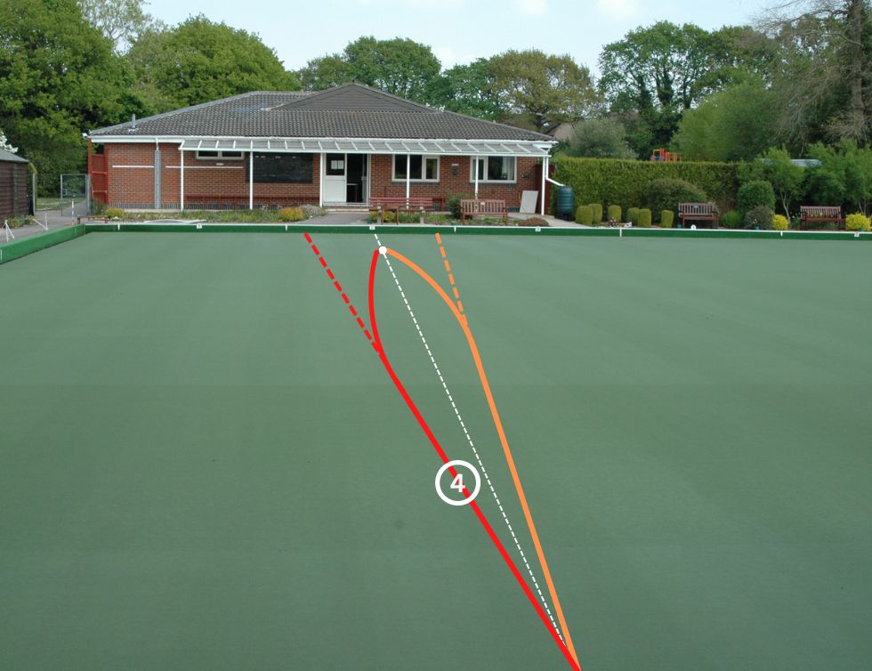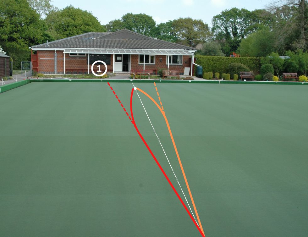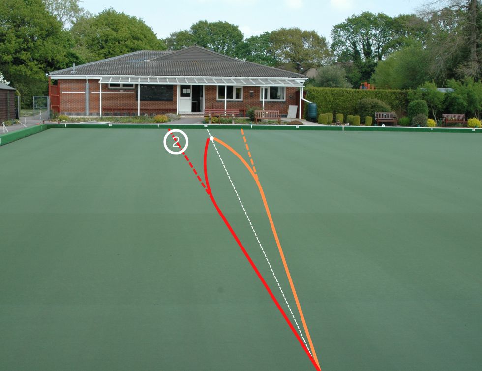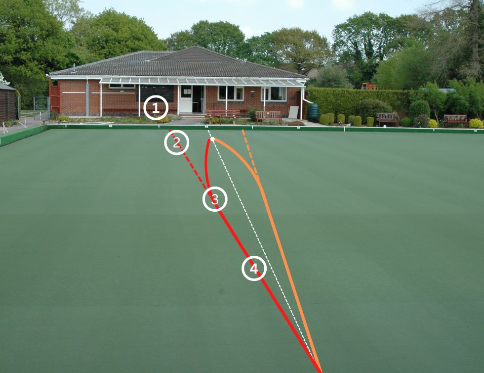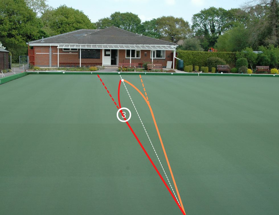 To send our bowl along the correct path we must imagine a line that extends beyond the point where the bowl will turn, and imagine we are bowling along that line, as if it’s not going to turn.